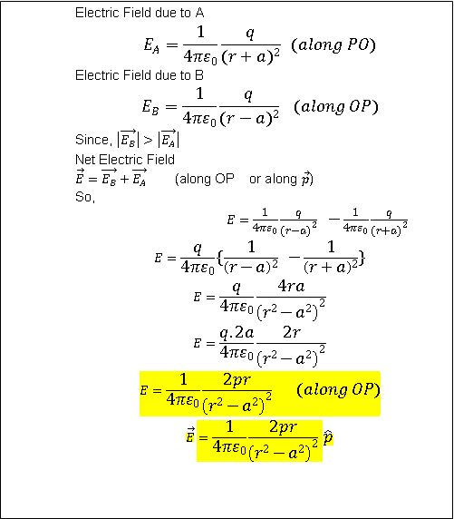 Let an Electric Dipole ‘AB’ having charge -q and +q separated at a distance 2a is placed in vacuum. If P is the point on the axial line at a distance ‘r’ from the centre of dipole, then