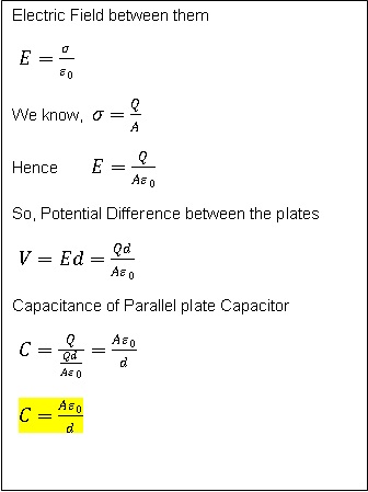 Let we have a parallel plate capacitor which has two parallel conducting plate of area ‘A’ and placed at a small distance ‘d’. If +Q and –Q charges are given to both plates then,